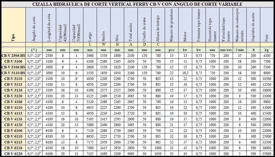 Cizalla hidráulica de corte vertical Ferry CB-V con ángulo de corte variable.